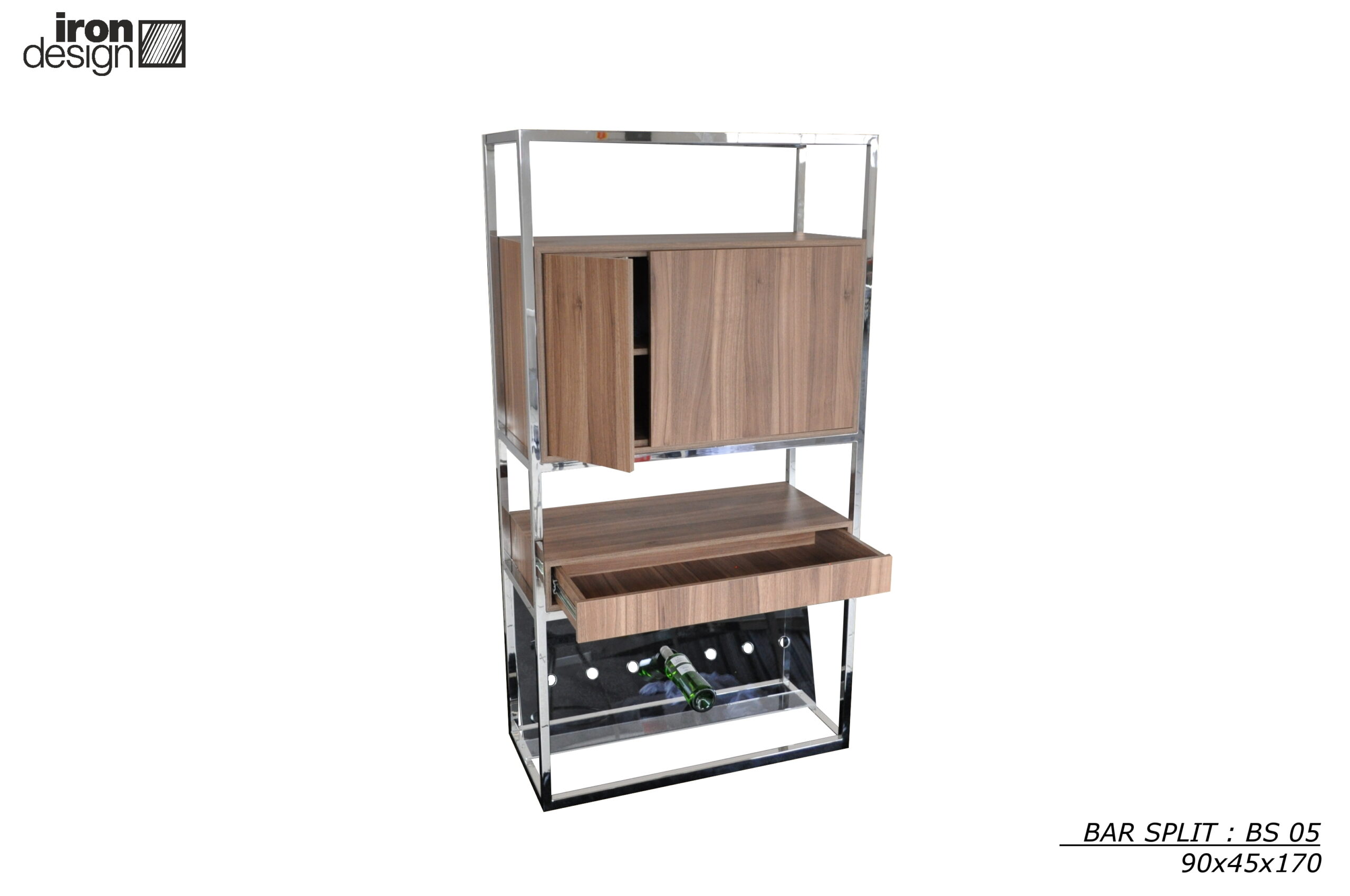 O Bar Split é fiel ao seu nome, representando o dividir e segmentar dos elementos. A parte funcional em mdf compreende portas e gaveta. Mas o charme está na adega em acrílico inclinada, deixando os vinhos suspensos.